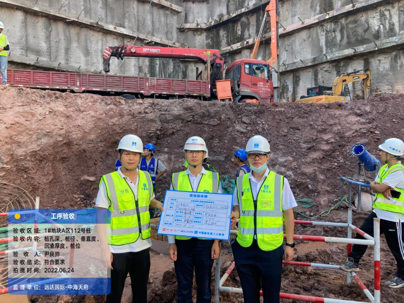 自2022年6月24日项目开始进行桩基施工,到8月24日超塔桩基施工完成,恰好历时两个月,共计施工桩基429根,浇筑混凝土8689.75m³。这两个月的时间,正值成都最为炎热的时节,气温居高不下,日均高温超过35℃,连续15天气温超过40℃。在不能进行夜间施工的情况下,项目人员全都头顶烈日,脚踏酷暑,坚守在施工第一线,项目监理部全体成员团结一心,众志成城,恪尽职守,全力以赴,认真完成各项工作任务,严把质量关,确保施工安全。两个月的时间里里,项目监理部共计进行材料验收78次;现场工序验收286,次见证取样送检144次,混凝土浇筑旁站59次,累计时长347小时零45分钟。