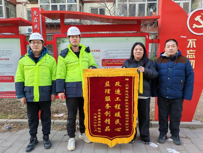 2026年1月26日,远达国际项目部收到了一面由罗庄南里社区居民送来的锦旗。锦旗上“改造工程暖民心,监理服务创精品”的金色字样,不仅体现了居民们对老旧小区改造工程的认可,更表达了对远达国际项目团队专业服务的高度赞誉。